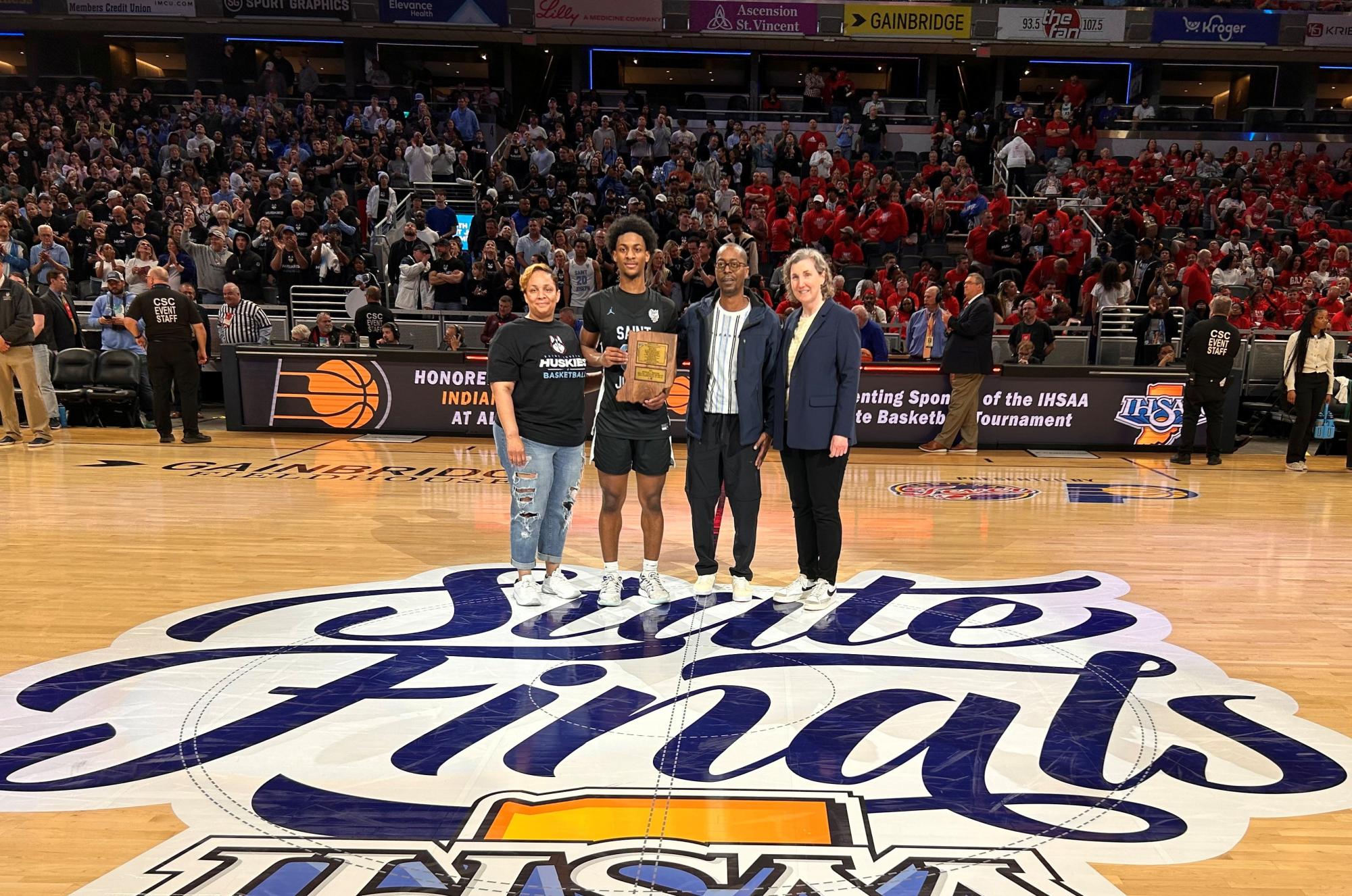 The Indiana Pacers and Indiana Fever, the presenting sponsors of the IHSAA Boys Basketball State Tournament, presented a $1,000 scholarship to the general scholarship fund at Saint Joseph High School in the name of Brashaun Woods.