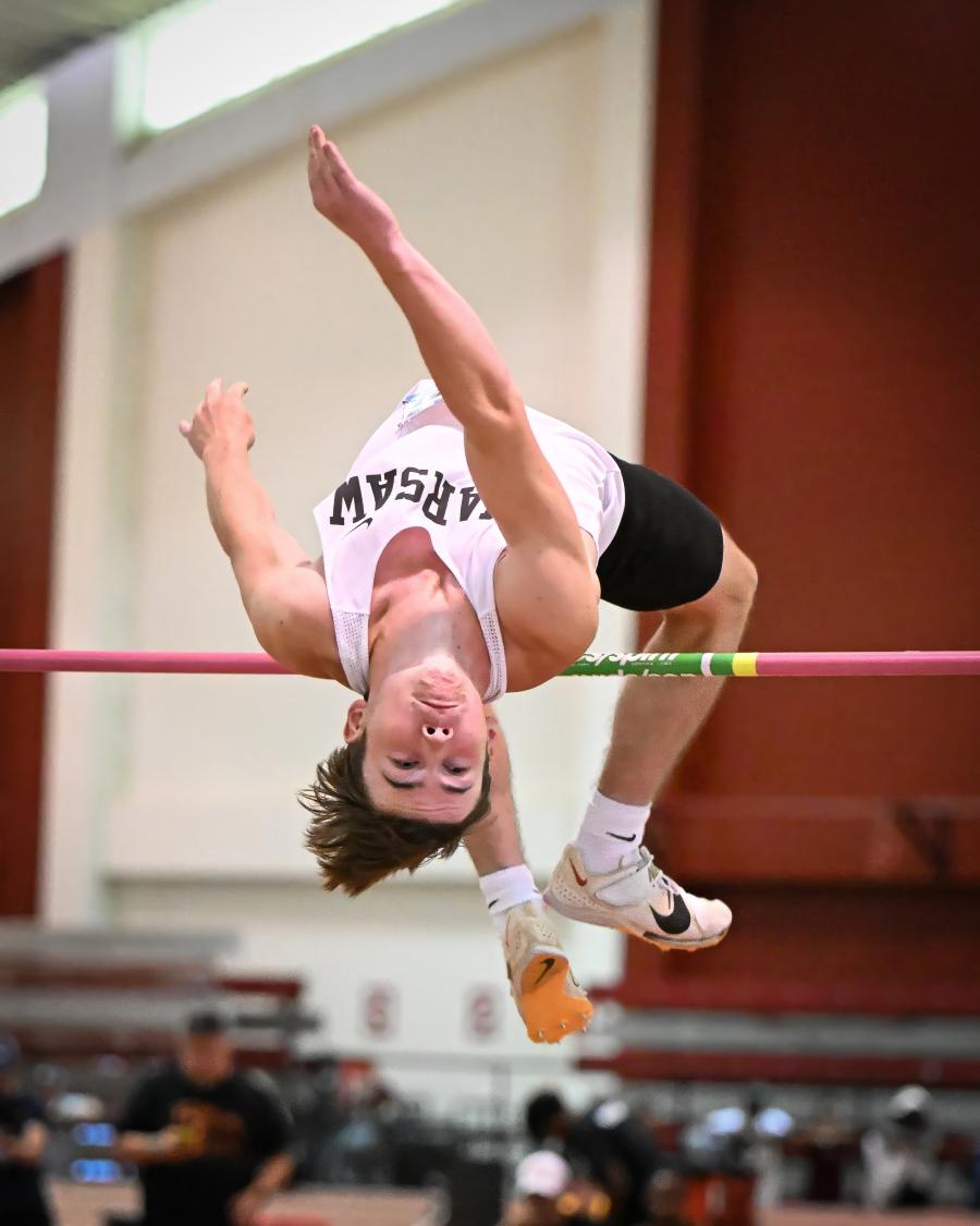 Going indoors was familiar to two state champions: Greenfield-Central high jumper Elliot Ryba (6 feet, 10 inches) and Hamilton Heights pole vaulter Peyton Quinn (16-3). Because of the rain, jumps were moved inside Gladstein Fieldhouse.
