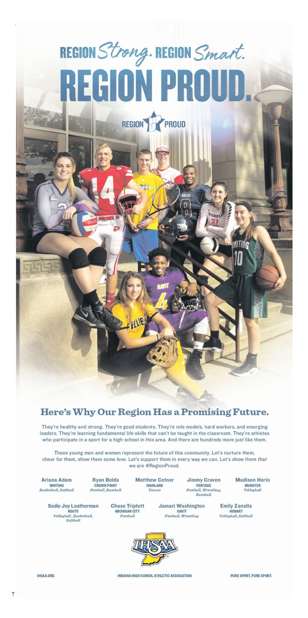 This year, the IHSAA is highlighting student-athletes in “The Region”—a collection of five diverse counties in northwest Indiana—through a series of newspaper ads. The Chicago media market dominates northwest Indiana, so it is sometimes hard to tell the story of education-based athletics in the far northwest corner of our state.