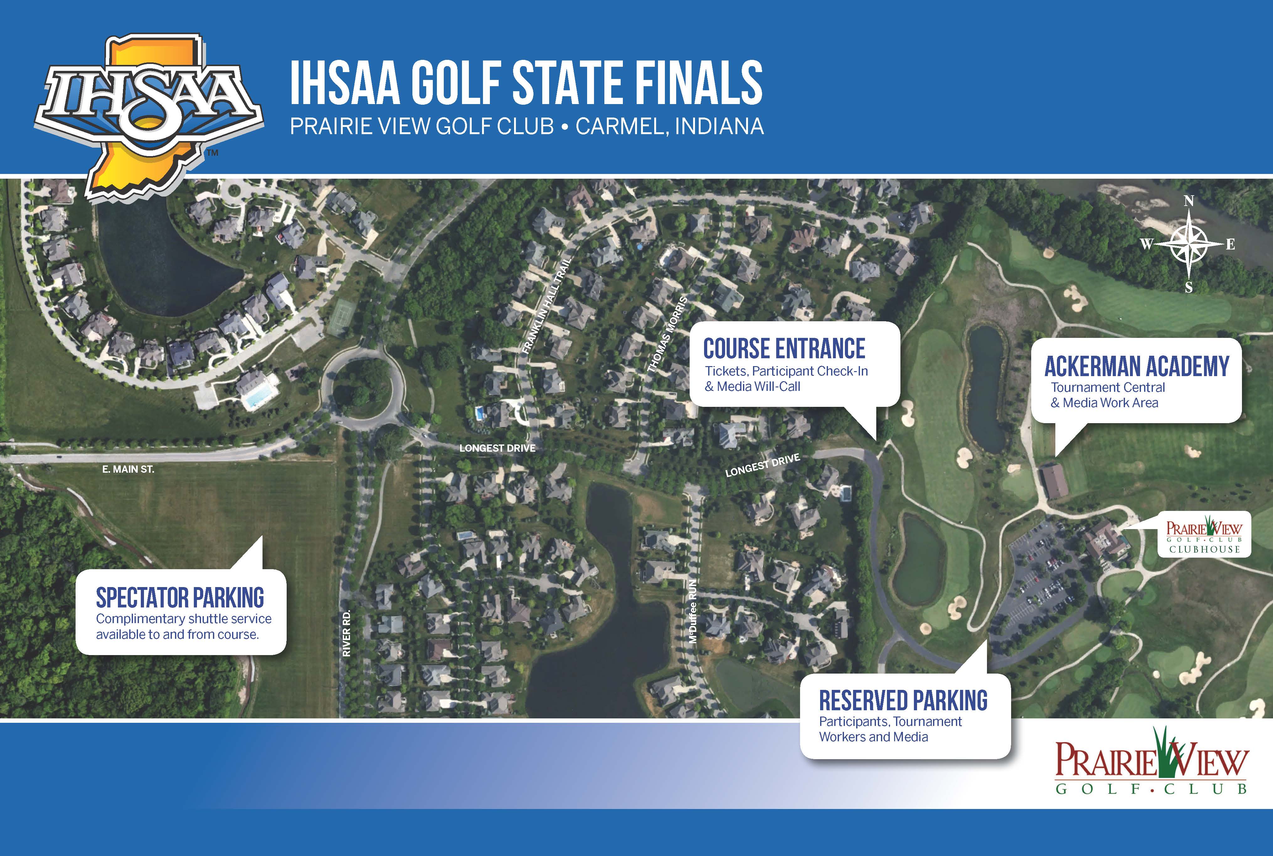 Parking: Spectators will use the off-site parking lot southwest of the roundabout at the intersection of Main Street and River Road and be shuttled to and from the golf course. Map